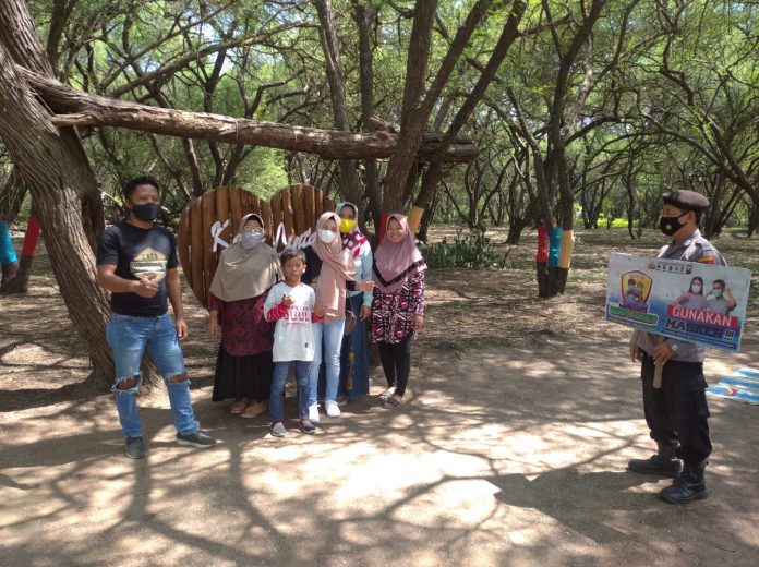 Selain memberikan himbauan protokol kesehatan, petugas Patroli juga mengingatkan pengunjung wisata untuk tetap waspada membawa barang bawaan jangan ditinggal begitu saja, karena setiap kesempatan bisa menimbulkan ambang gangguan kejahatan.