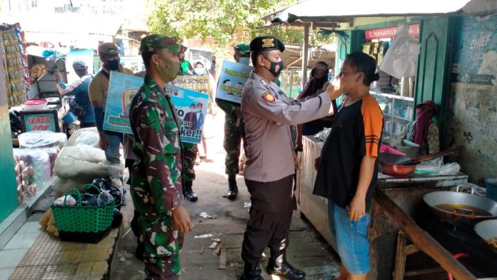 Pada kesempatan siang itu di lakukan oleh anggota Polsek Bancar bersama Koramil Bancar Melaksanakan giat YUSTISI Pendisiplinan Protokol Kesehatan dengan sasaran pengunjung Pasar Layur Ds Banjarjo kecamatan Bancar Tuban.