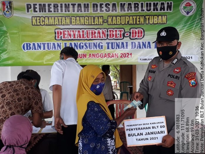 seopini.com-polrestubanpoldajatim Polsek Bangilan Polres Tuban Polda Jatim – Rabu tanggal 31 Maret 2021 pukul 09.00 Wib s/d Selesai, dilaksanakan penyaluran Bantuan Langsung Tunai Dana Desa (BLT DD) bulan Maret di Balaidesa Kablukan kecamatan Bangilan Tuban.