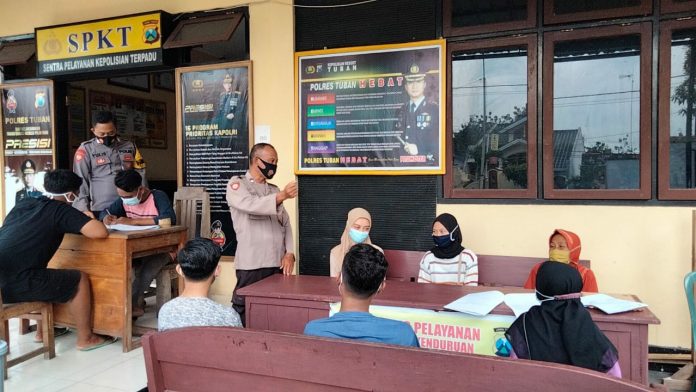 seopini.com – PolresTubanPoldaJatim Ps. Kasium Polsek Kenduruan AIPTU Sugono memberikan himbauan protokol kesehatan covid-19 kepada para pemohon SKCK di ruang tunggu pelayanan Polsek Kenduruan, Senin (14/6/2021).