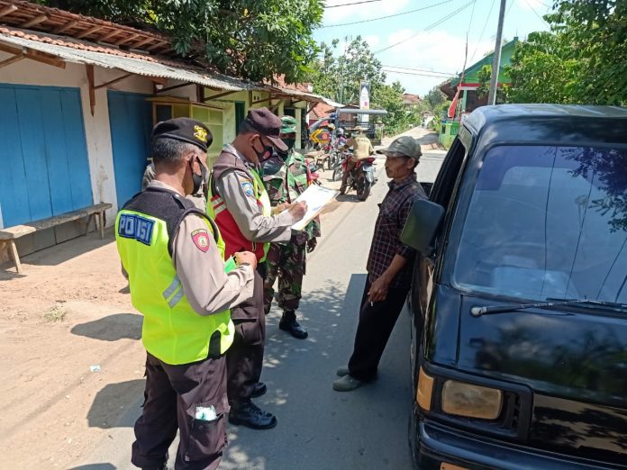 Nampak terlihat petugas giat Yustisi Protokol Kesehatan berada di jalan poros Desa Tawaran, sekaligus memberikan Himbauan kepada warga masyarakat untuk disiplin menerapkan Protokol Kesehatan utamanya memakai masker.