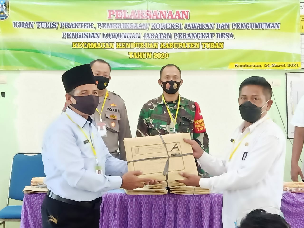 Pelaksanaan Ujian Perangkat Desa dihari oleh Drs.Joko Purnomo Camat Kenduruan, AKP. Budi Handoyo,SH. Kapolsek Kenduruan, Kapten Teguh Haribowo Danramil Kenduruan, Agung Tri wibowo Kabag pengadaan barang jasa dan administrasi pemb. Kab.Tuban, Achmad Nursulton.s.stp. Kasi kerjasama Desa dan Kawasan Perdesaan Kab.Tuban, Afnan Agus Santosa.Skep.Ns.MM. Ka UPTD Puskesmas Kenduruan, Panitia Ujian Perangkat Desa dan Peserta Ujian Perangkat Desa.