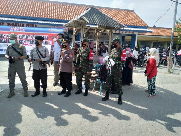 seopini.com – PolresTubanJatim AKP SIMON TRIYONO Kapolsek Palang bersama sama dengan Forkopimka Kecamatan Palang, dan Bhabinkamtibmas serta Babinsa Desa Karangagung Kecamatan Palang Kabupaten Tuban, melaksanakan giat Yustisi dan pembagian Masker GRATIS serta berikan Himbauan tentang Wajib Masker Implementasi dari Inpres No. 06 Tahun 2020 dan Perbup Kab Tuban No. 65 Tahun 2020,serta pemberlakuan PPKM Mikro yang bertujuan untuk melakukan pencegahan penyebaran virus COVID-19,Kepada pengujung dan penjual yang berada di Pasar Karangagung turut Desa Karangagung Kecamatan Palang Kabupaten Tuban, pada hari Selasa ( 04/05/2021).