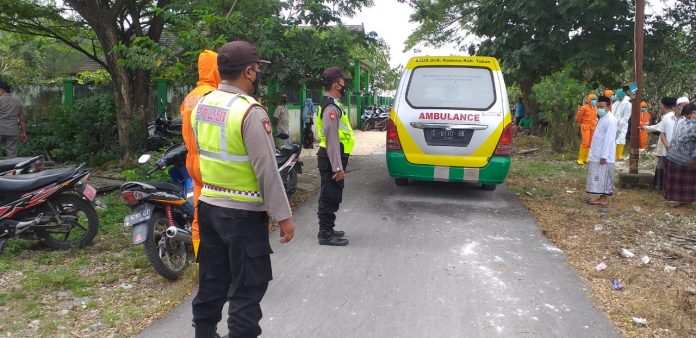 seopini.com-polrestubanpoldajatim Kapolsek Plumpang AKP Wahyu Dwi Waluyo, S.H. beserta anggota dan TNI serta Sat Pol PP Plumpang memberikan pengamanan saat pemakaman salah seorang warga yang diduga covid-19. Warga yang meninggal dunia pada hari Rabu tanggal 24 maret 2021 08.45 Wib tersebut diketahui berstatus Pasien Protable Covid-19. Kamis, (25/03/2021).