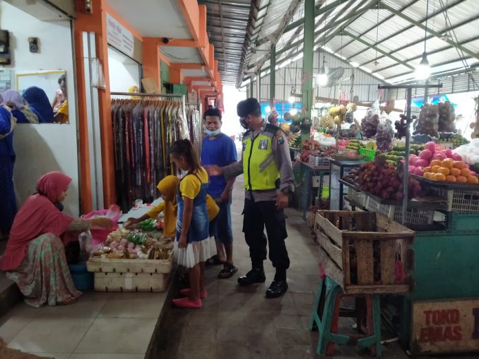 seopini.com-polrestubanpoldajatim Anggota Kepolisian Sektor Rengel Polres Tuban menggelar patroli jalan kaki dan dialogis di Pasar Desa Rengel Kecamatan Rengel Kabupaten Tuban. Sabtu, (06/03/2021).