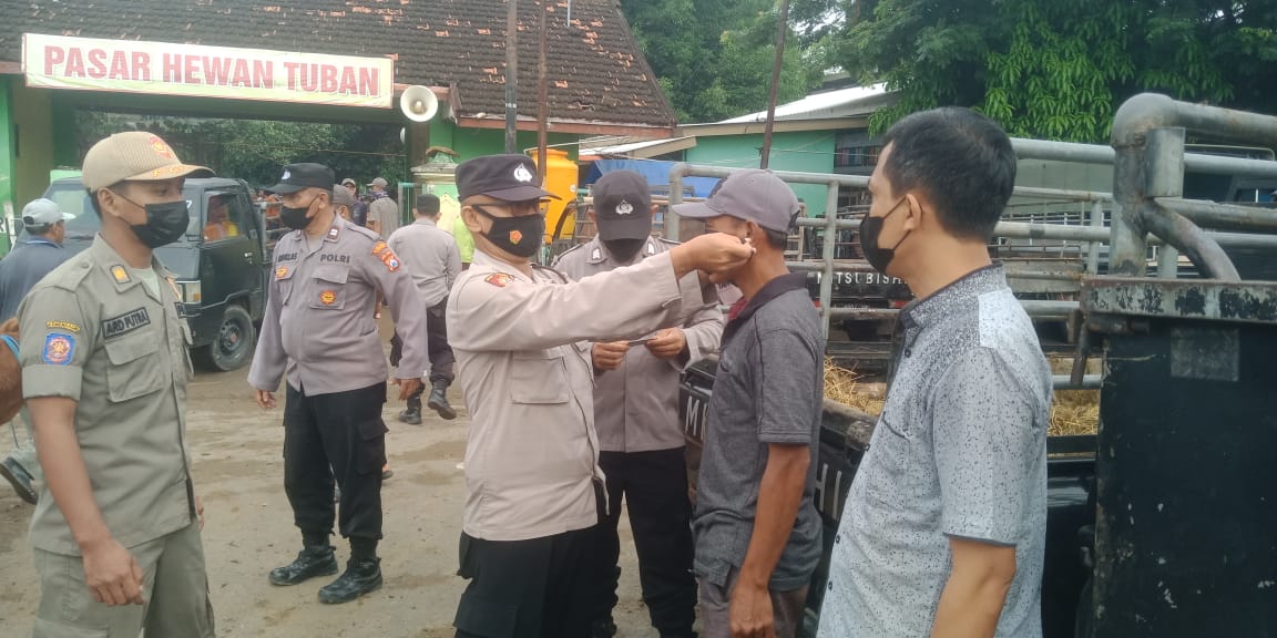 Dipimpin langsung oleh Kapolsek Semanding AKP Carito, S.H. kegiatan dilaksanakan di Pasar Hewan Kel. Gedongombo Kec. Semanding,  dengan cara periksa pedagang dan pembeli yang tidak mengunakan masker dan tidak bisa menunjukkan Kartu vaksin maupun di Aplikasi Peduli Lindungi.