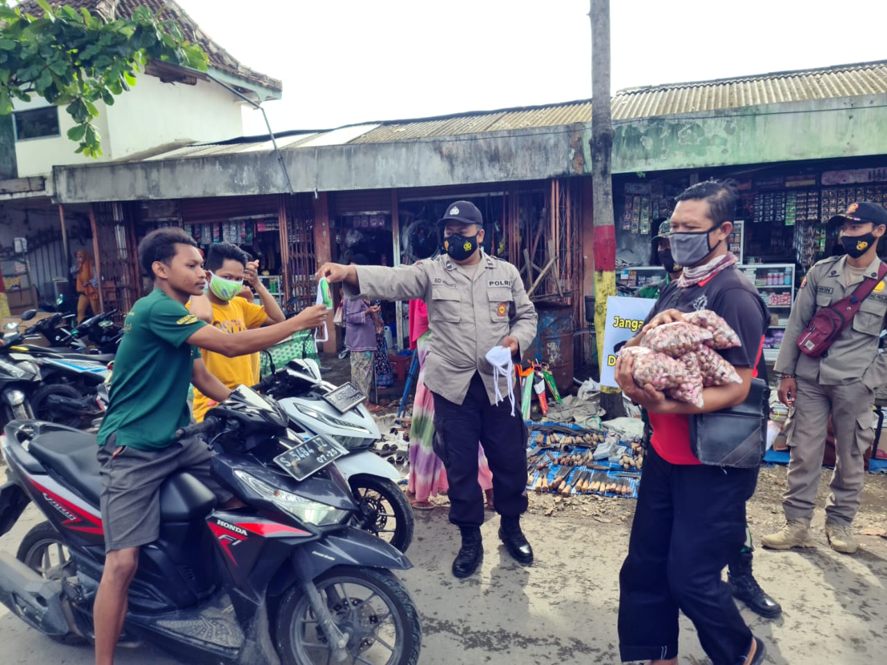 seopini.com-polrestubanpoldajatim Jajaran Polsek Tuban  membagi-bagikan tiga ribu maskerkepada masyarakat, Senin (15/3). Pembagian dilakukan di berbagai titik ruas jalan di wilayah Soko