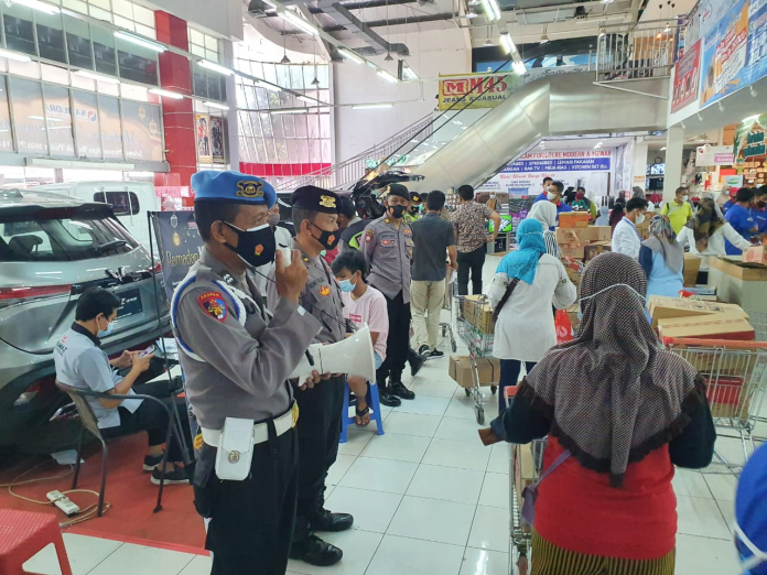 seopini.com – PolresTubanJatim Pada hari Senin tanggal 03/05/2021, Waka Polsek Tuban Iptu Hartono SH memimpin langsung anggotannya melaksanakan giat Yustisi protokol kesehatan di beberapa swalayan yang ada di wilayah hukum Polsek Tuban.Seperti nampak dalam gambar Aiptu Sukir memberikan himbauan kepada pengunjung swalayan Samudra yang sedang melakukan aktifiats belanja.