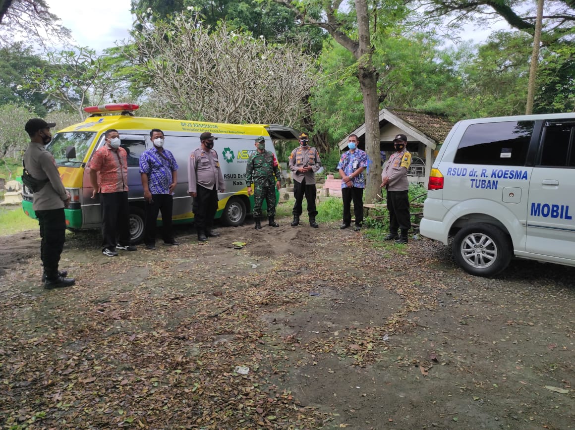 seopini.com-polrestubanpoldajatim Personel Polsek Widang dipimpin oleh Kapolsek AKP Totok Wijanarko, S.Pd., melakukan pengamanan prosesi pemakaman jenazah tercomfrim Covid-19 di Desa Widang, Selasa (09/03/2921).