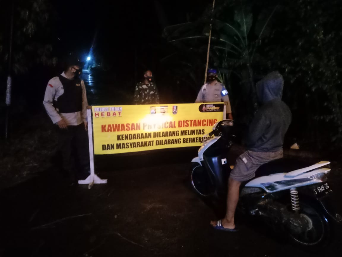 Dalam rangka mendukung program pemerintah tersebut, anggota Polsek Senori Polres Tuban Polda Jawa Timur bersama relawan Covid-19 desa Rayung menerapkan kawasan tertib physical distancing di Dsn, Kedungkebo Desa Rayung, Minggu (11/4/2021) malam.