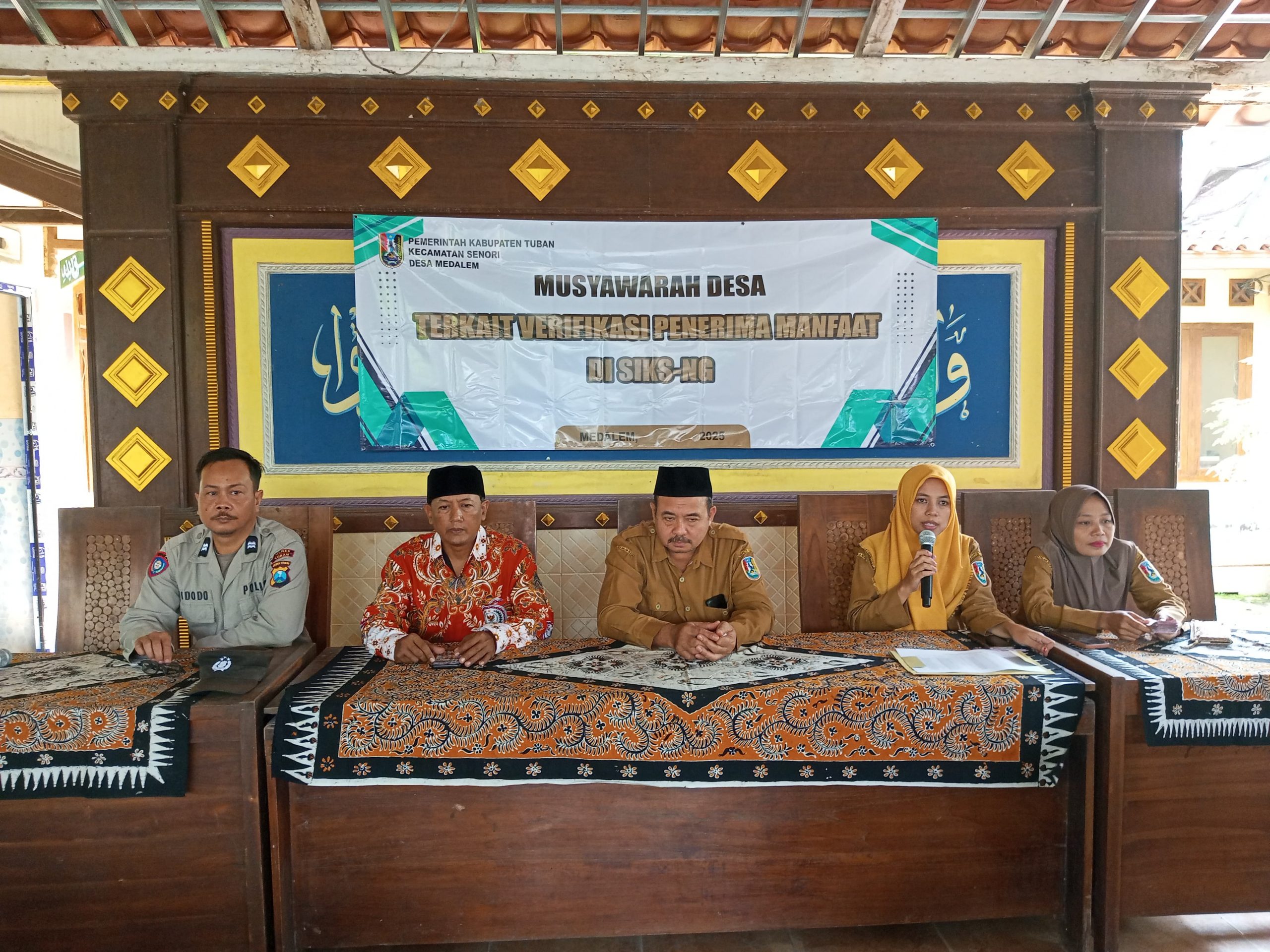 Senori – Ps Kanit Binmas Polsek Senori Polres Tuban Polda Jatim Aiptu Widodo yang juga mengemban tugas sebagai anggota Polmas Desa Medalem, menghadiri kegiatan Musyawarah Desa (Musdes) terkait verifikasi penerima manfaat di SIKS-NG yang berlangsung di Balai Desa Medalem Kecamatan Senori, Selasa (11/3/2025) pagi.