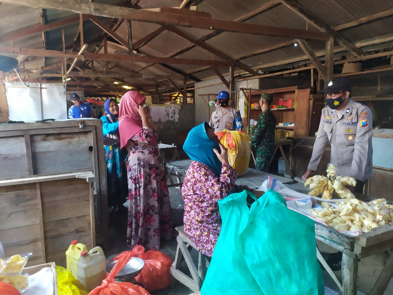 “Pasar menjadi tempat perkumpulan masyarakat yang sedang melakukan jual beli. Kami menghimbau para masyarakat untuk menggunakan masker dan apabila tidak memiliki masker kesehatan agar menggunakan masker dari kain guna mencegah terjadinya penularan virus covid-19,” kata Aiptu Ahmad Lakin.