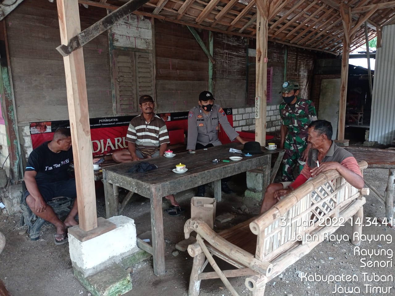 Senori – Bripka Putut Aris Anggota Bhabinkamtibmas Desa Rayung Polsek Senori Polres Tuban Jawa Timur bersama Babinsa Serka Solikin bersinergi melaksanakan sambang warga guna memberikan pembinaan protokol kesehatan kepada warga Desa didesa binaan, Senin (31/01/2022).