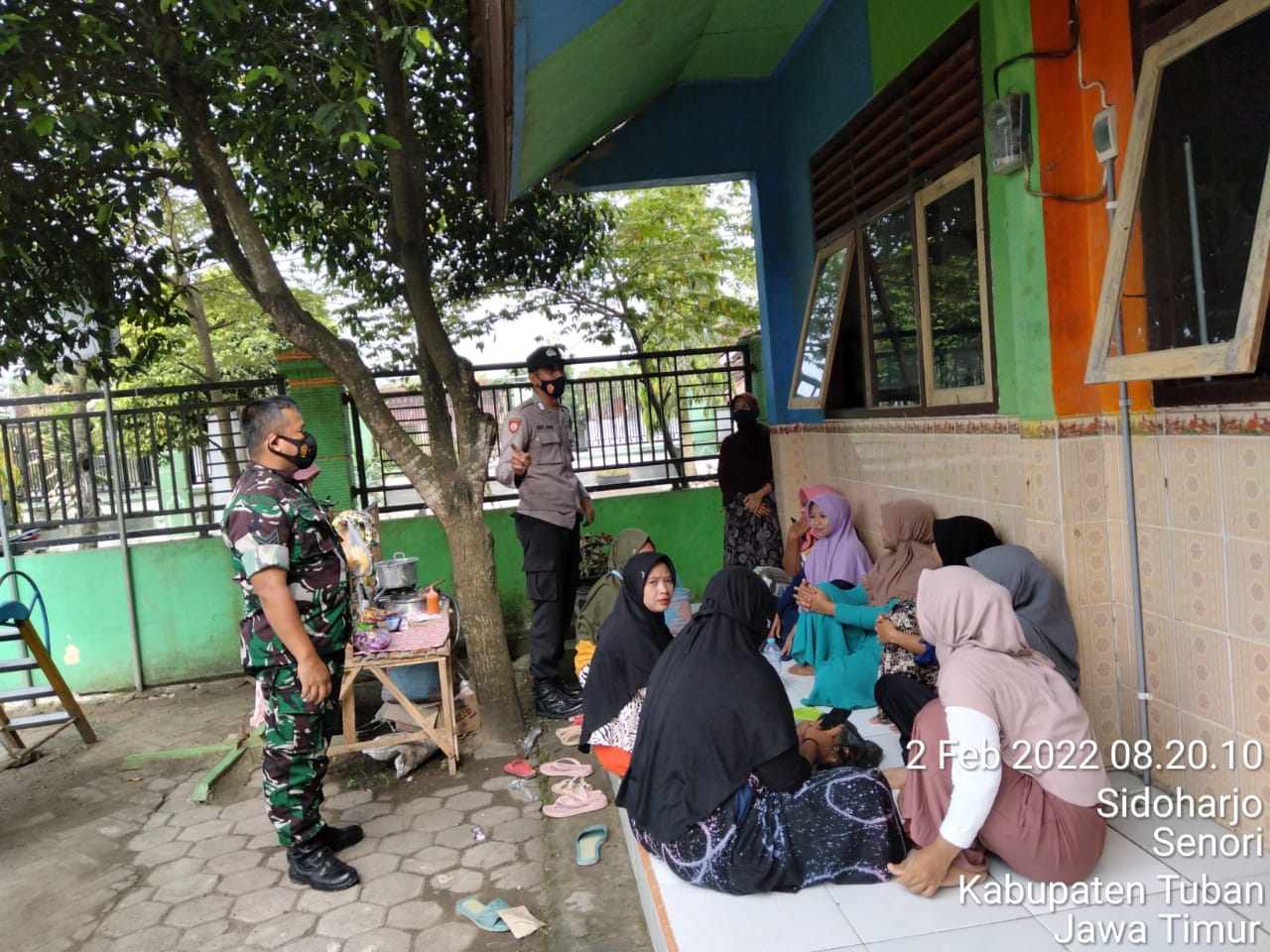Senori – Personel Polsek Senori Polres Tuban Jawa Timur bersama anggota TNI dari Koramil Senori bersinergi melaksanakan patroli sambang kepada warga Desa Sidoharjo kususnya emak-emak yang sedang menunggu anaknya di salah satu sekolah dasar negeri desa setempat.