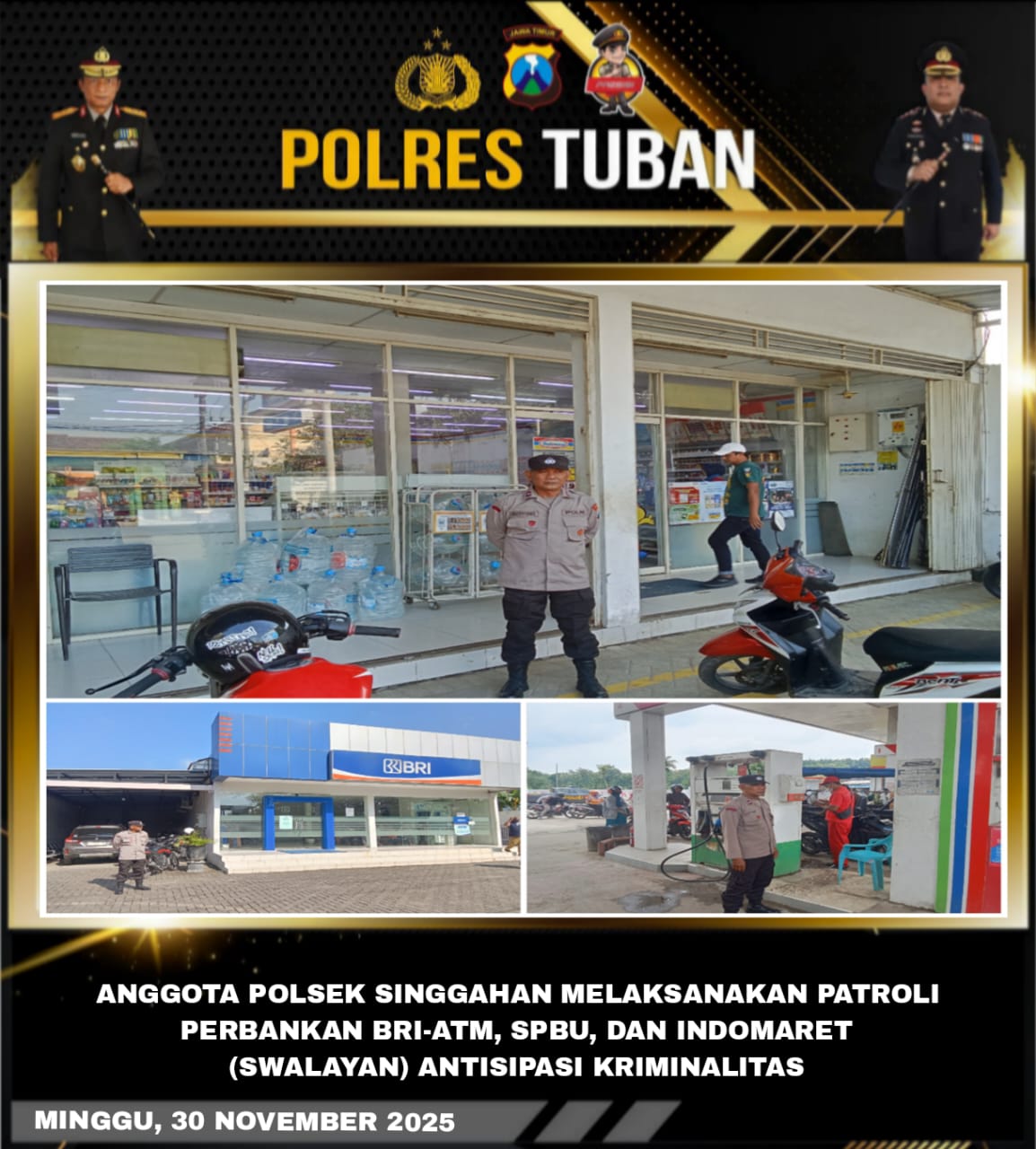 Seperti pada Minggu (30/11/2025) unit patroli Polsek Singgahan melaksanakan patroli obyek vital dengan sasaran pertokoan Indomart, kantor Perbankan/ BRI (ATM), SPBU serta jalur poros.