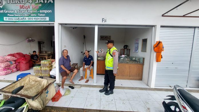 Guna mengantisipasi terjadinya tidak pidana kriminalitas di wilayah Polsek jenu polres Tuban Polda Jatim, anggota Polsek jenu Bripka Okky SW., bersama rekan melaksanakan sambang ke pertokoan kuning di pasar samudera beji Jenu.