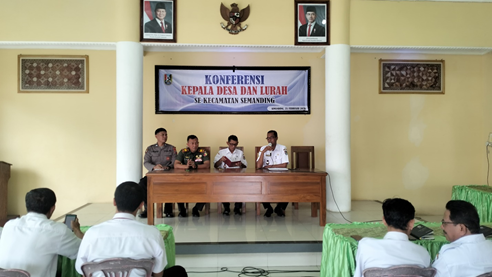 Semanding, Rabu (25/02/2026) – Polmas Desa semanding, Aiptu Eko Sulistyono menghadiri kegiatan Konferensi Lurah dan Kepala Desa Di Balai Desa Semanding. Kegiatan tersebut turut dihadiri drh Cipta Dwipriyata (Camat Semanding), Kapt Inf Sunaryo (Danramil Semanding), Ka puskesmas Semanding dan Wire, Kepala UPTD Kec. Semanding, Kades/Lurah se-Kec. Semanding, Tiga pilar Desa Semanding, Dan tamu undangan.