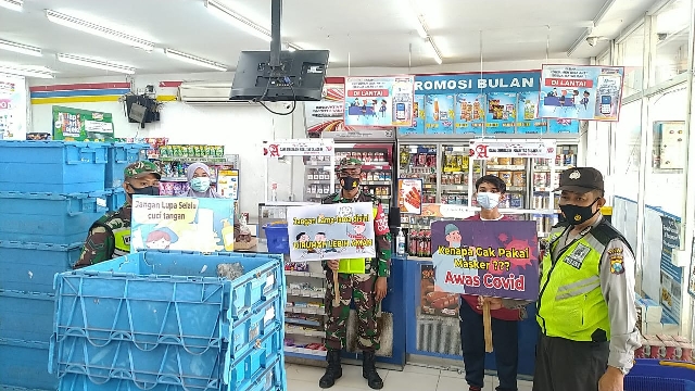 seopini.com – Sinergi Personel Polsek Tambakboyo Polres Tuban Bersama Koramil Tambakboyo sampaikan himbauan protokol kesehatan pada Adaptasi kebiasaan baru di minimarket Indomart Desa Tambakboyo Kec Tambakboyo Minggu (28/3/2021) pukul 08.30 Wib