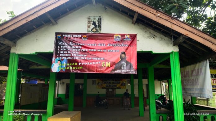 ” Pembagian masker, edukasi, sosialisasi tentang protokol kesehatan 5-M terus digencarkan. Seperti yang dilakukan oleh Bhabinkamtibmas Polsek Widang Desa Kedungharjo Bripka Mujianto dengan memasang banner Imbauan untuk disiplin menerapkan protokol Kesehatan 5-M.