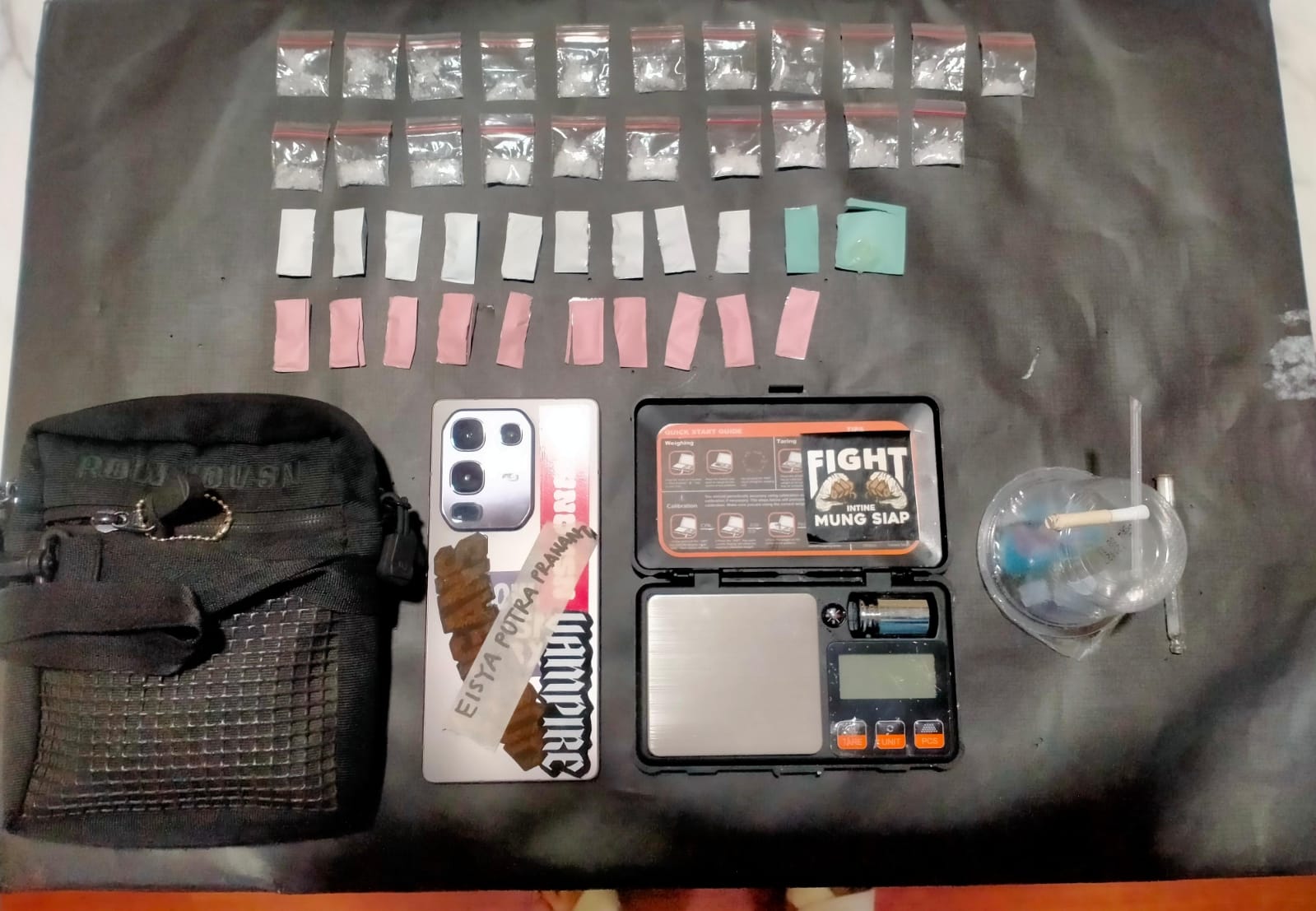 Selain itu, turut diamankan sejumlah barang bukti lain seperti alat hisap, pipet kaca, timbangan digital, hingga ponsel yang diduga digunakan untuk transaksi.