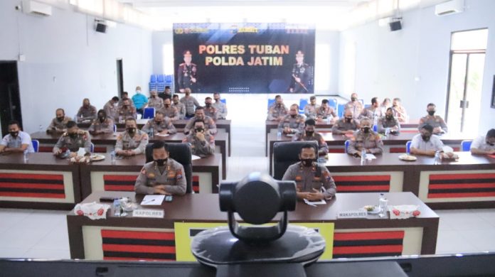 seopini.com – PolresTubanPoldaJatim Kepala Kepolisian Resor Tuban AKBP Ruruh Wicaksono, S.I.K., S.H., M.H., bersama PJU serta Kapolsek jajaran mengikuti konferensi video dengan Kepala Kepolisian Republik Indonesia, Selasa (01/06/2021).