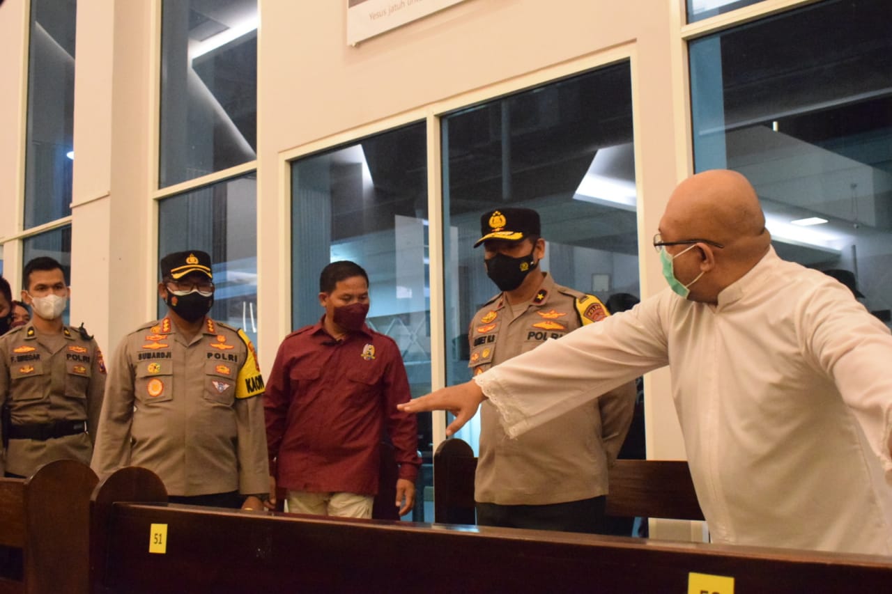 seopini.com – Sidoarjo – Wakapolda Jawa Timur Brigjen Pol. Slamet Hadi Supraptoyo didampingi Kapolresta Sidoarjo Kombes Pol. Sumardji, melakukan Pengecekan terhadap pengamanan Ibadah Jumat Agung & Persiapan Paskah di Gereja Santa Maria Annuntiata, Sidoarjo, Jumat (2/4/2021) malam. Beliau