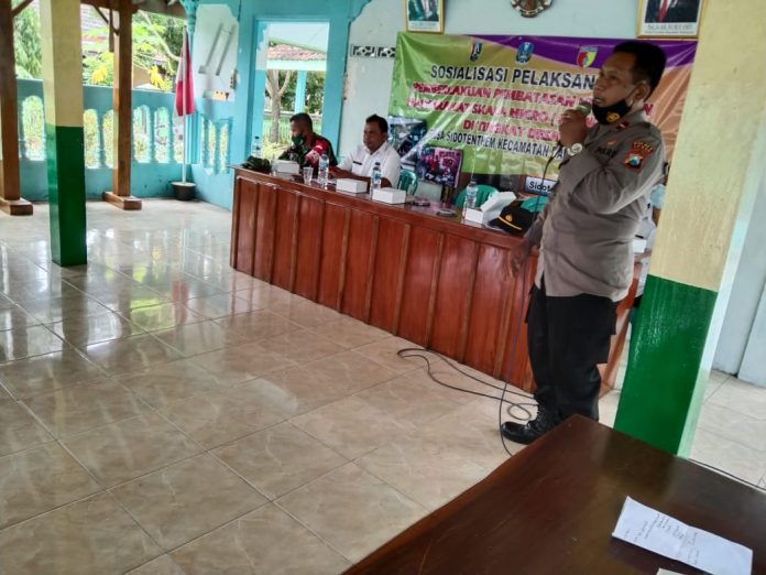 seopini.com-polrestubanpoldajatim Polsek Bangilan Polres Tuban Polda Jatim – Dalam rangka mensukseskan program dari pemerintah terkait penanganan Covid-19 yang diatur dalam instruksi menteri dalam negeri (Inmendagri) No 3 Tahun 2021 terkait penerapan pemberlakuan pembatasan kegiatan masyarakat (PPKM) Mikro Zonasi Wilayah guna pengendalian penyebaran virus Covid-19, pemerintahan desa Sidotentrem bersama Satgas Covid-19 melaksanakan sosialisasi program tersebut Dan Wakapolsek Bangilan Ipda Komari sebagai Narasumber, Rabu (10/3/2021).